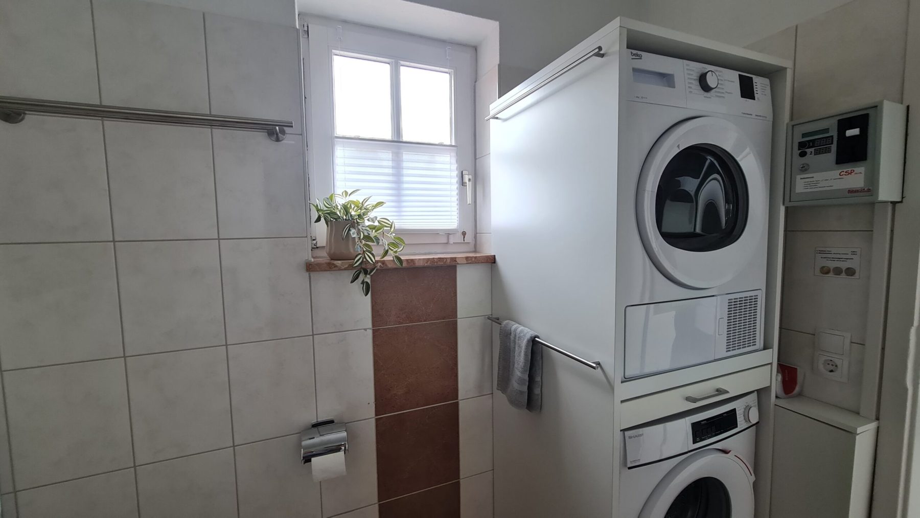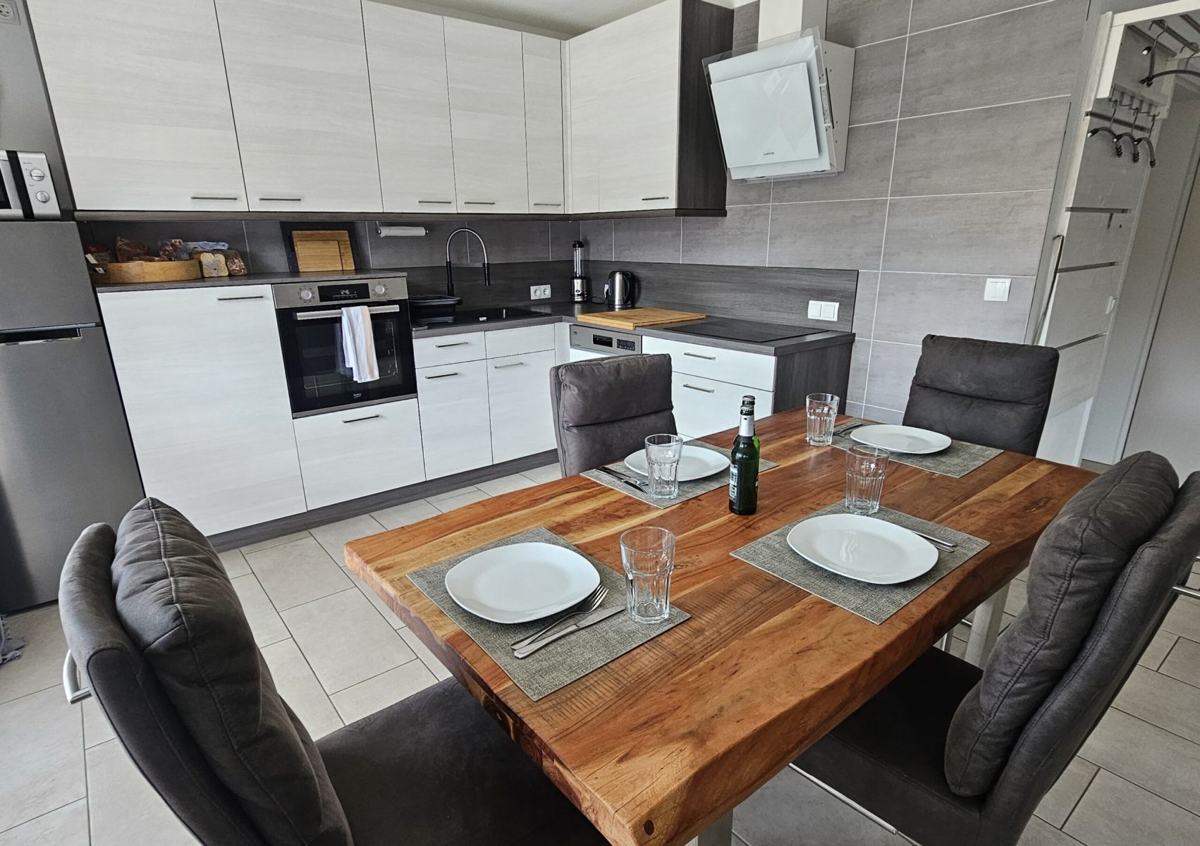Induktionsherd, Backofen, Geschirrspülmaschine, Kühlschrank mit Gefrierfach, Kaffeemaschine, Wasserkocher, Toaster, Geschirr, Besteck, Kochtöpfe, Pfannen.