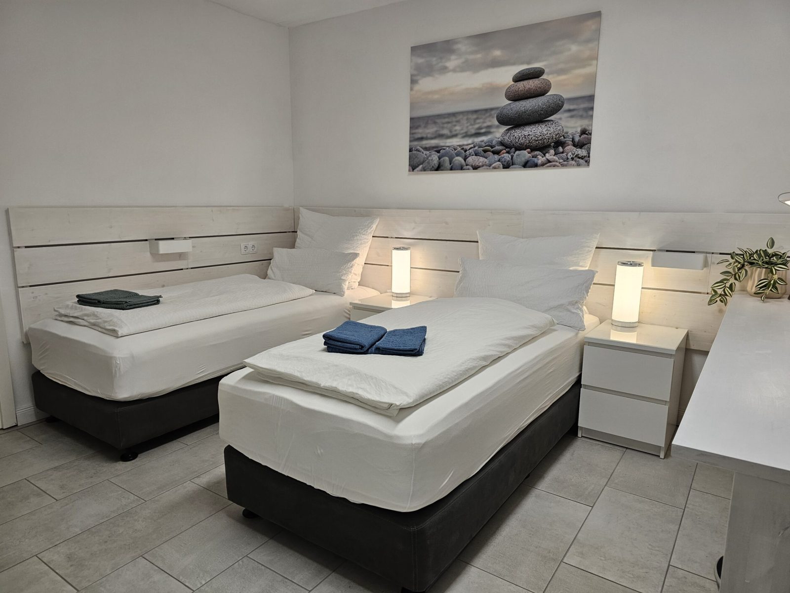 Vier komfortable Boxspringbetten, einzeln oder getrennt zu stellen.