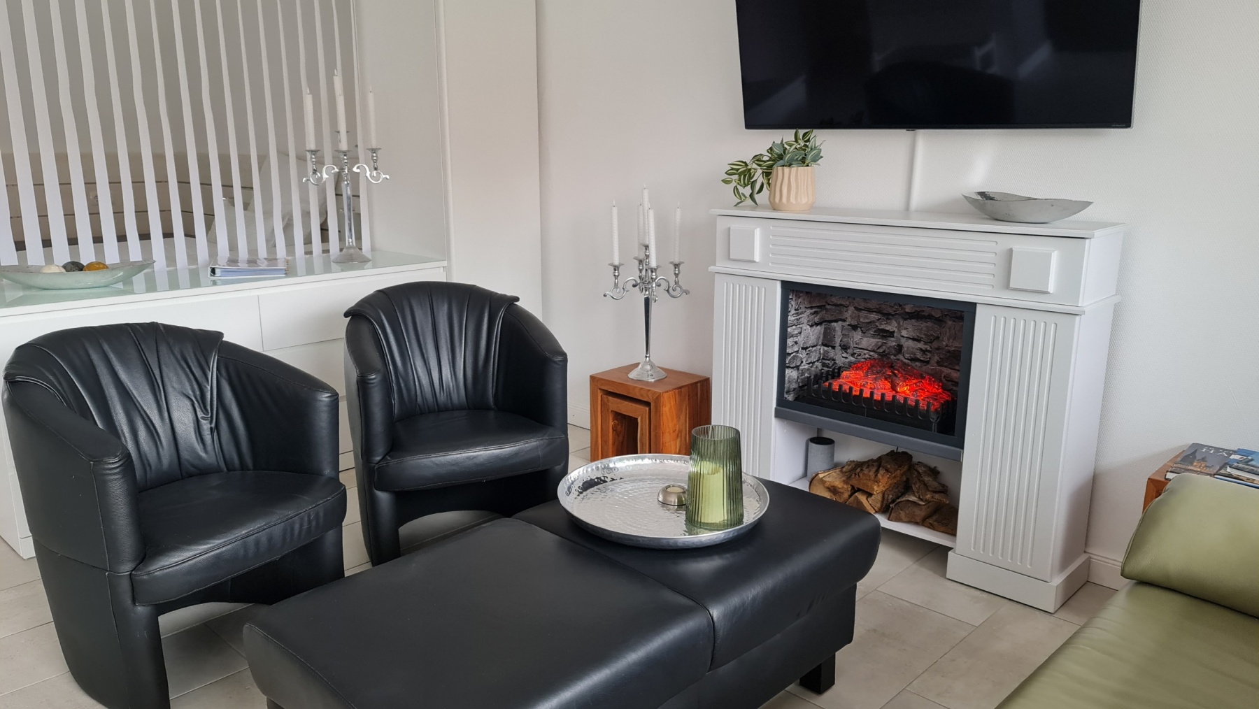 Wohnbereich mit Smart TV, Deko-Kamin und Echo Dot.